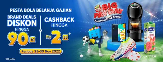 koranindopos.com – Jakarta. Program belanja saat gajian Blibli, Big PayDay (BPD) kembali hadir pada 25-30 November 2022. Selama program berlangsung, pelanggan berkesempatan mendapatkan penawaran promo mulai dari cashback hingga Rp2 juta, Diskon Gercep serba Rp10 ribu, Brand Deals dengan potongan harga hingga 90%, Late Night Sale and Official Store Vouchers, dan gratis ongkir ke seluruh Indonesia.