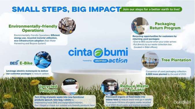 Beberapa program yang dilakukan, diantaranya daur ulang hingga 4 ton sampah kemasan sepanjang tahun 2023 untuk mewujudkan ekonomi sirkular bersama Recycling Village, Liberty Society, dan 180 Degrees, dengan koleksi eksklusif daur ulang telah terjual habis di microsite Blibli Cinta Bumi Eco Hub. Blibli Tiket juga bekerjasama dengan Magalarva mengolah 3,5 ton limbah makanan dari operasional bisnis menjadi pakan ternak. Bagi pelanggan setia Blibli Tiket, selain turut serta dalam program pengembalian sampah kemasan yang selanjutnya diolah kembali menjadi shredded paper oleh Daya Selaras, kini juga bisa menukarkan Blibli Tiket Rewards untuk donasi pohon lewat aplikasi Blibli.