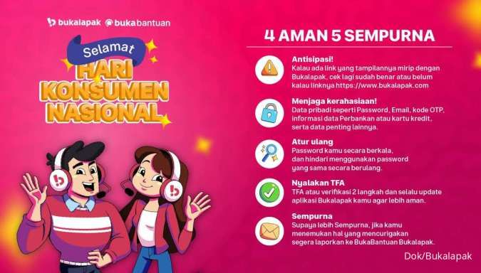 koranindopos.com – Jakarta. Saat ini, masyarakat dari berbagai kalangan memanfaatkan platform online dalam memenuhi kebutuhan. Dengan meningkatnya aktivitas online, resiko terjadinya kejahatan siber juga ikut meningkat. Untuk itu, Bukalapak kembali mengajak pengguna untuk menjadi smart users melalui kampanye online 4 AMAN 5 Sempurna, yang merupakan kependekan dari Antisipasi, Menjaga Kerahasiaan, Atur ulang password, Nyalakan TFA (Two Factor Authentication), dan agar Sempurna, hubungi BukaBantuan jika menemukan sesuatu yang mencurigakan pada akun atau transaksi yang dilakukan di Bukalapak.