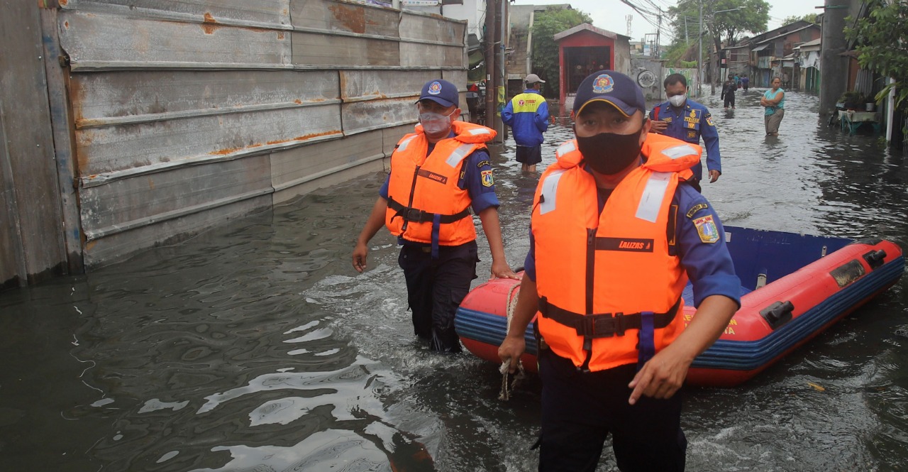 WAHYU TRIONO/KORANINDOPOS.COM PENANGANAN BENCANA:  Petugas terjun ke lokasi banjir dengan perahu karet. Pj) Gubernur DKI Heru Budi Hartono mengimbau ASN Pemprov DKI tidak mengambil cuti jelang cuaca ekstrem.
