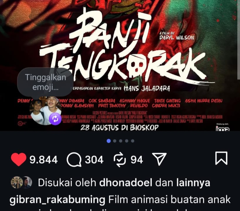 Dalam unggahan di akun Instagram resminya, Gibran memperlihatkan rasa kagum setelah menyaksikan trailer Panji Tengkorak yang baru saja dirilis. “Saya sudah nonton trailernya (geser slide) yang ciamik, visualnya modern dan keren,” tulis Gibran. Ia menutup komentarnya dengan kalimat singkat penuh semangat: “Saya sih gas!”