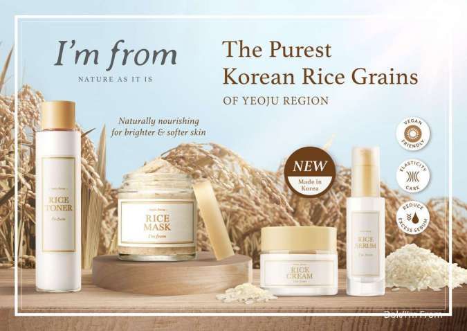 Beras telah dikenal selama berabad-abad akan khasiatnya untuk penyembuhan kulit serta penggunaannya sebagai bahan baku anti-penuaan kulit. Memahami khasiat beras untuk kulit, rangkaian produk I’m From Rice Range menggunakan bahan dasar beras premium organik yang berasal dari Desa Deokpyeong, Yeoju, Korea Selatan, yang ditanam tanpa pestisida dan menghasilkan beras yang mengandung 3x lebih banyak serat dari beras biasa. Hal ini membuatnya kaya akan amino acid, lysin, gamma oryzanol, vitamin B1, B2, mineral serta bahan aktif lainnya yang dapat menjaga kelembutan dan kecerahan kulit.