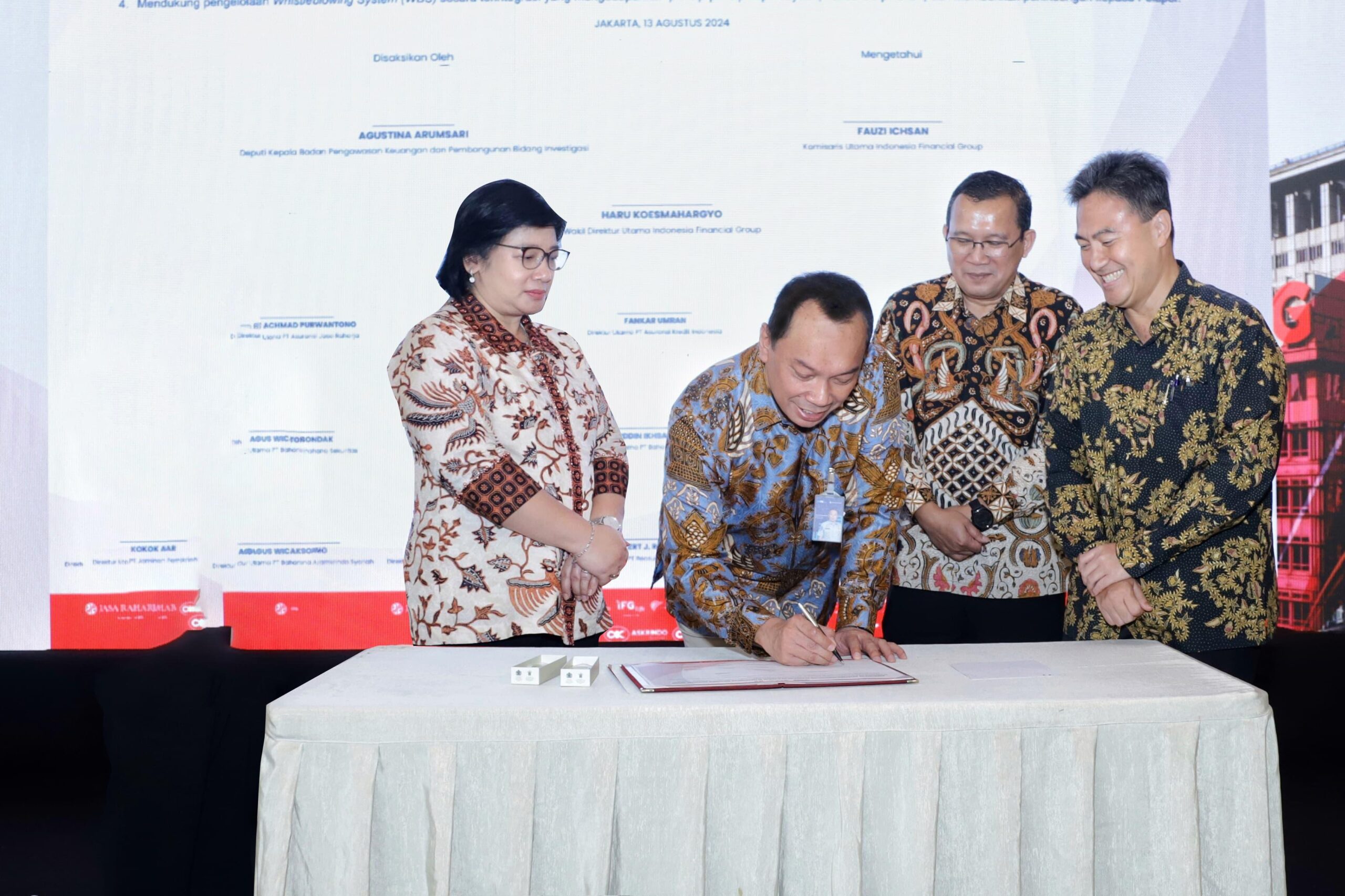 koranindopos.com, Jakarta – Jasa Raharja, dan seluruh anggota Holding Indonesia Financial Group (IFG), menandatangani Komitmen Anti-Fraud yang disaksikan Badan Pengawasan Keuangan dan Prmbangunan (BPKP). Penandatanganan dilakukan oleh direktur utama masing-masing anggota holding, di Gedung Jiwasraya, Jakarta, pada Selasa (13/08/2024).