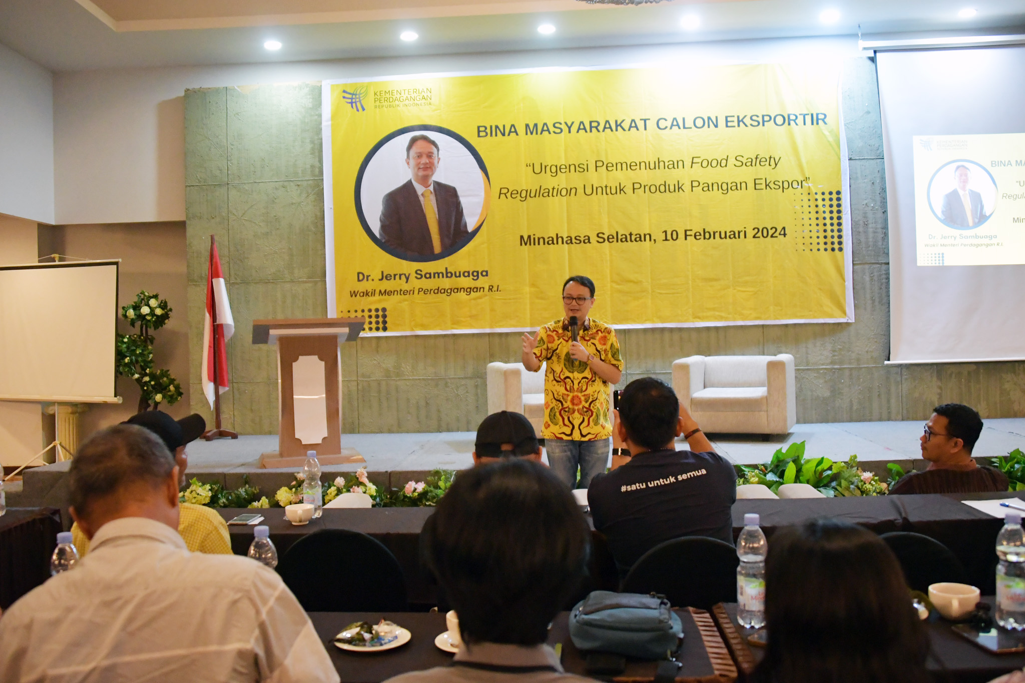 koranindopos.com – SulawesiUtara. Wakil Menteri Perdagangan, Jerry Sambuaga menjadi pembicara pada kegiatan Bina Masyarakat Calon Eksportir dengan tema “Urgensi Pemenuhan Food Safety Regulation untuk Produk Pangan Ekspor” yang berlangsung di Amurang, Minahasa Selatan, Sulawesi Utara, Sabtu (10 Feb).