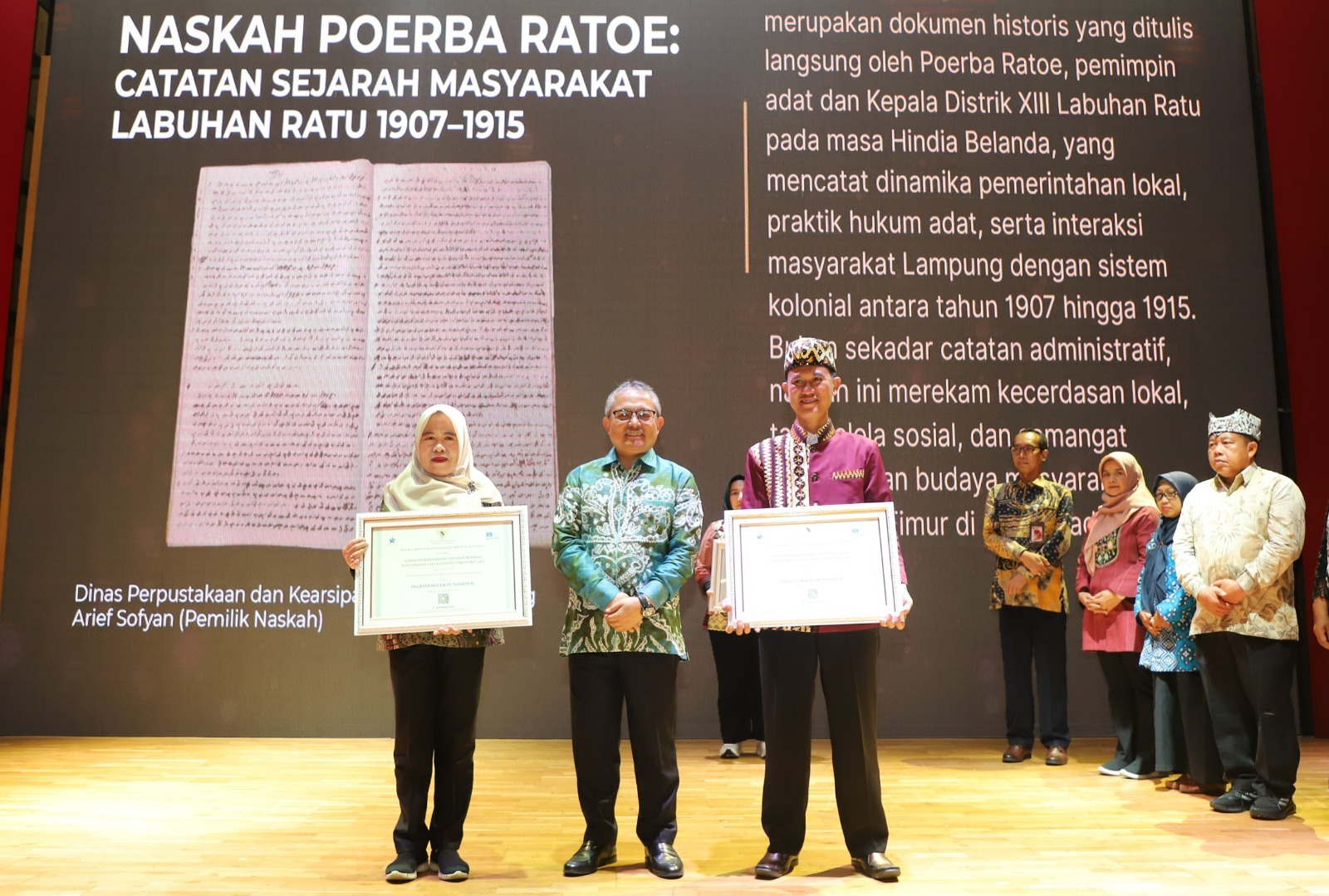 Masih dari Lampung, Naskah Poerba Ratoe: Catatan Sejarah Masyarakat Labuhan Ratu (1907–1915) merekam hukum adat, sistem pemerintahan lokal, dan interaksi masyarakat dengan kekuasaan kolonial. Naskah ini diajukan oleh Dinas Perpustakaan dan Kearsipan Provinsi Lampung, dengan Arief Sofyan sebagai pemiliknya, dan menampilkan tatanan sosial serta struktur kekuasaan masyarakat Labuhan Ratu pada awal abad ke-20.