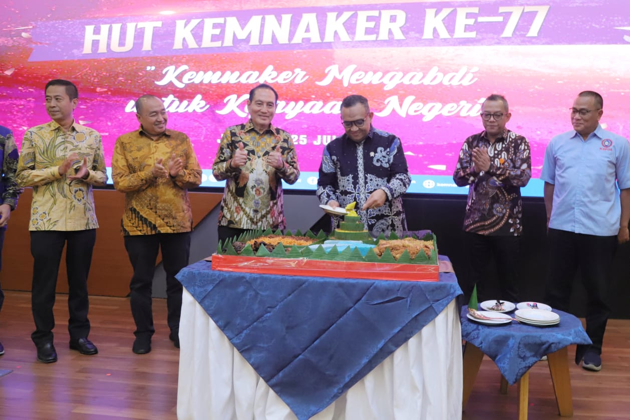 koranindopos.com, Jakarta – Wakil Menteri Ketenagakerjaan Afriansyah bersama seluruh jajarannya merayakan upacara peringatan HUT ke-77 Kemnaker di ruang Tridarma, Jalan Gatot Subroto, Kavling 51, Jakarta, Kamis (25/7/2023). Ia berharap momentum HUT Kemnaker ke-77 ini menjadi momentum untuk merefleksikan kembali kontribusi Kemnaker dalam sejarah perjalanan pembangunan nasional dan perkembangan bangsa Indonesia.
