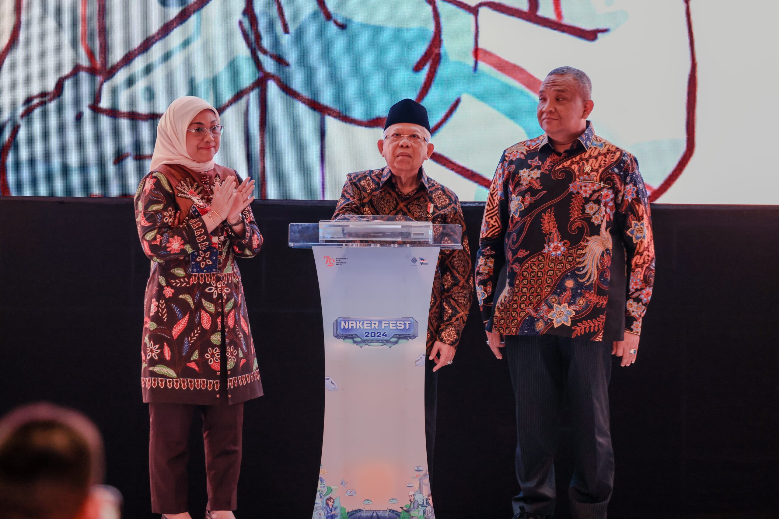 koranindopos.com, Jakarta – Wakil Presiden KH Ma’ruf Amin resmi membuka Naker Fest 2024 di JIEXPO Kemayoran, Jakarta, pada Jumat (23/8/2024). Pembukaan ditandai dengan penekanan tombol layar digital oleh Wapres Ma’ruf didampingi Menteri Ketenagakerjaan Ida Fauziyah dan Wakil Menteri Ketenagakerjaan Afriansyah Noor.