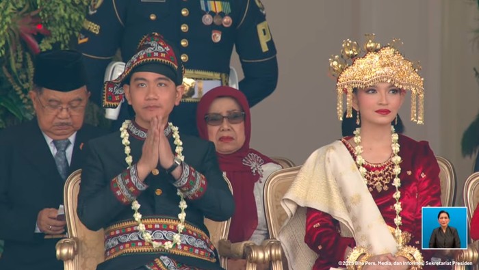 Gibran hadir didampingi sang istri, Selvi Ananda, serta kedua putra-putrinya. Penampilan mereka semakin mencuri perhatian karena masing-masing mengenakan busana daerah yang berbeda. Gibran tampil gagah dengan busana hitam khas Gayo, lengkap dengan ikat pinggang dan sarung di bagian bawah. Sementara itu, Selvi terlihat anggun mengenakan pakaian adat khas Palembang, yang sarat akan makna budaya dan tradisi.